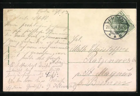 Personenbezogene Daten auf der Rückseite der Karte wurden durch blauen Textmarker unkenntlich gemacht. Die blauen Stellen sind auf die Vorderseite durchgeweicht und wirken sich negativ auf das Postkartenfoto aus