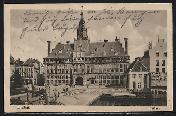 AK Emden / Ostfr., Rathaus mit Denkmal