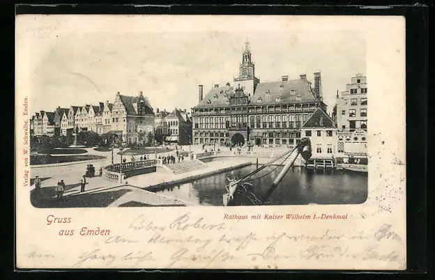 AK Emden, Rathaus mit Kaiser Wilhelm I.-Denkmal