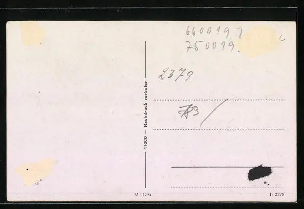 Personenbezogene Daten auf der Rückseite der Karte wurden durch blauen Textmarker unkenntlich gemacht. Die blauen Stellen sind auf die Vorderseite durchgeweicht und wirken sich negativ auf das Postkartenfoto aus