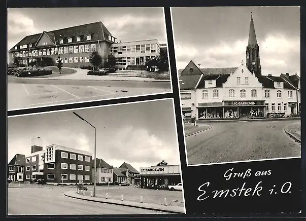 AK Emstek i. O., Geschäft J. C. Gardewin mit Kirche
