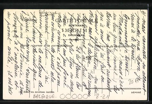 Personenbezogene Daten auf der Rückseite der Karte wurden durch blauen Textmarker unkenntlich gemacht. Die blauen Stellen sind auf die Vorderseite durchgeweicht und wirken sich negativ auf das Postkartenfoto aus