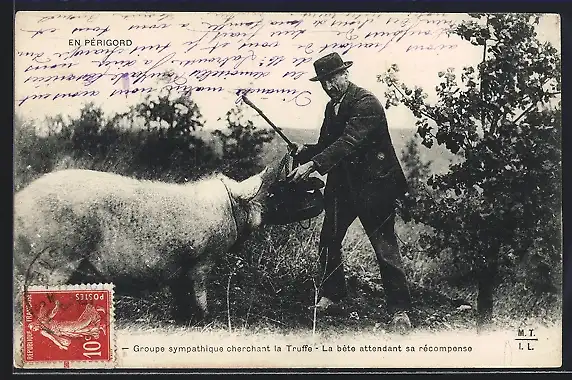 AK En Périgord, Groupe sympathique cherchant la truffe, La bête attendant sa récompense, Mann mit Trüffelschwein