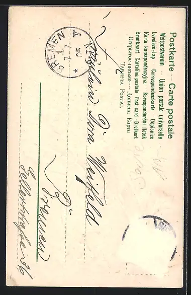 alte Ansichtskarte, gelaufen 1905, Briefmarke entfernt, rückseitig Oberflächenschaden, guter Zustand