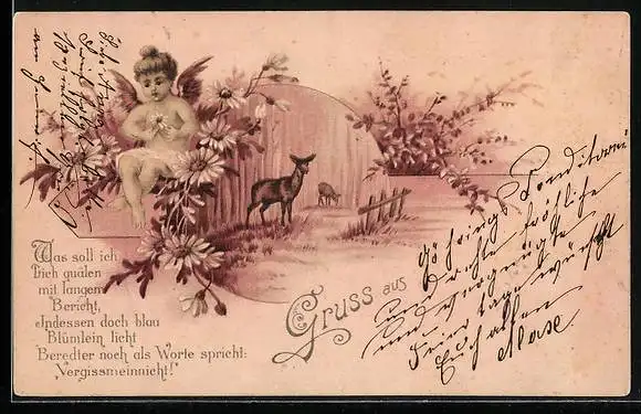 AK Engel mit Blumen und Rehe auf einer Wiese