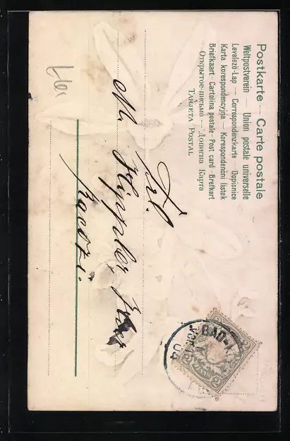 Personenbezogene Daten auf der Rückseite der Karte wurden durch blauen Textmarker unkenntlich gemacht. Die blauen Stellen sind auf die Vorderseite durchgeweicht und wirken sich negativ auf das Postkartenfoto aus