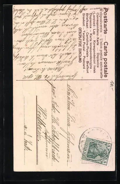 Personenbezogene Daten auf der Rückseite der Karte wurden durch blauen Textmarker unkenntlich gemacht. Die blauen Stellen sind auf die Vorderseite durchgeweicht und wirken sich negativ auf das Postkartenfoto aus