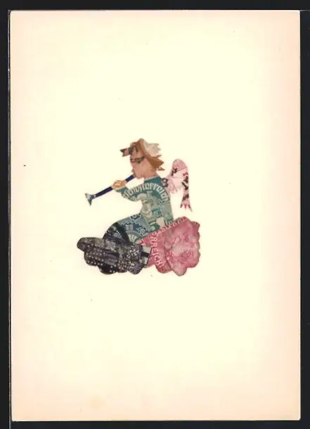 AK Engel mit Fanfare auf Wolke, Briefmarkencollage