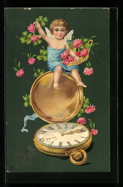 AK Engel mit Kleeblättern an einer goldenen Taschenuhr