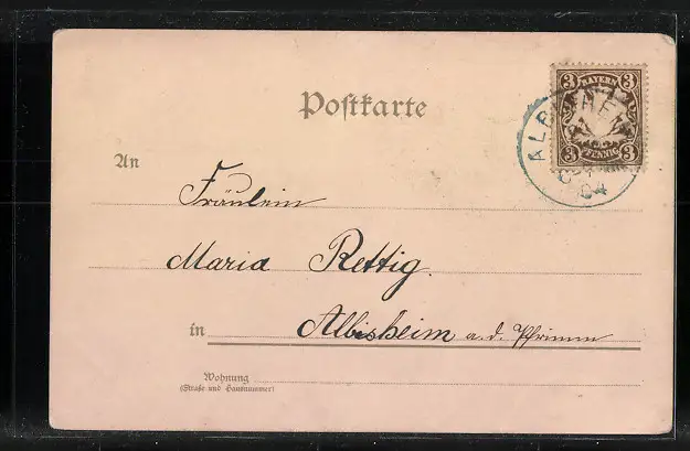 Personenbezogene Daten auf der Rückseite der Karte wurden durch blauen Textmarker unkenntlich gemacht. Die blauen Stellen sind auf die Vorderseite durchgeweicht und wirken sich negativ auf das Postkartenfoto aus