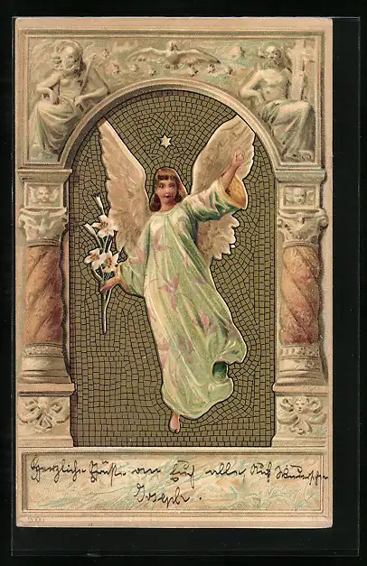 AK Engel schwebt mit Blumen in der Hand unter einem Torbogen