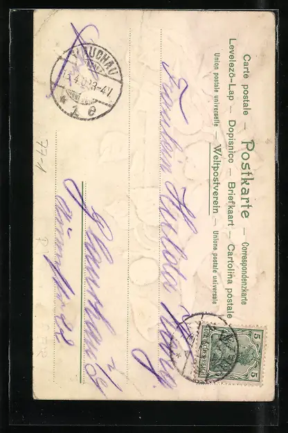 Personenbezogene Daten auf der Rückseite der Karte wurden durch blauen Textmarker unkenntlich gemacht. Die blauen Stellen sind auf die Vorderseite durchgeweicht und wirken sich negativ auf das Postkartenfoto aus