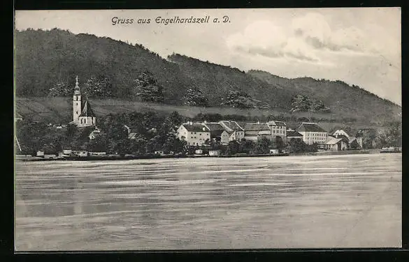 AK Engelhardszell a. D., Uferpartie mit Kirche
