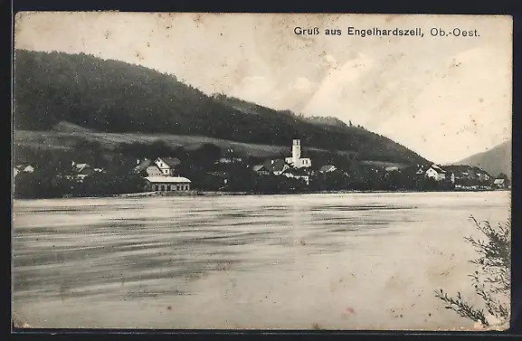 AK Engelhartszell /Ob.-Oest., Uferpartie mit Kirche