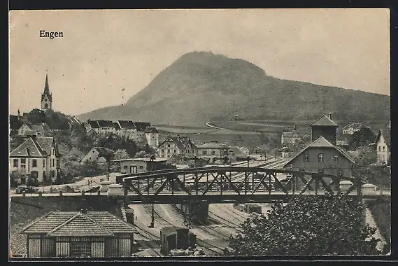 AK Engen, Ortsansicht mit Eisenbahnstrecke und Brücke