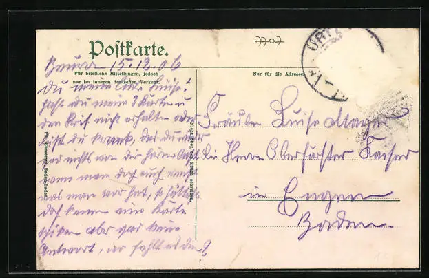 alte Ansichtskarte, gelaufen 1906, Briefmarke entfernt, rückseitig Oberflächenschaden, guter Zustand