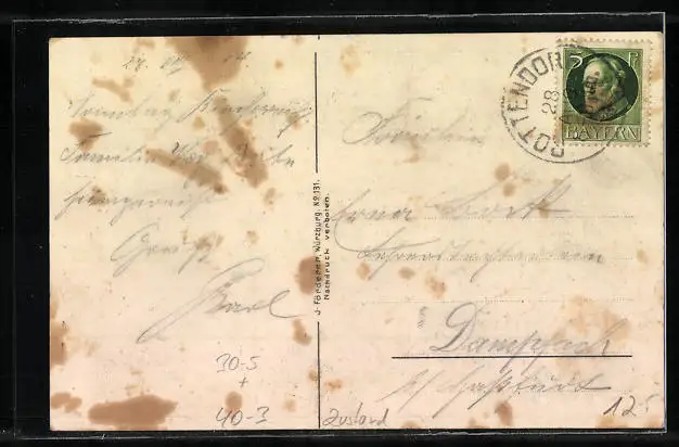 Personenbezogene Daten auf der Rückseite der Karte wurden durch blauen Textmarker unkenntlich gemacht. Die blauen Stellen sind auf die Vorderseite durchgeweicht und wirken sich negativ auf das Postkartenfoto aus