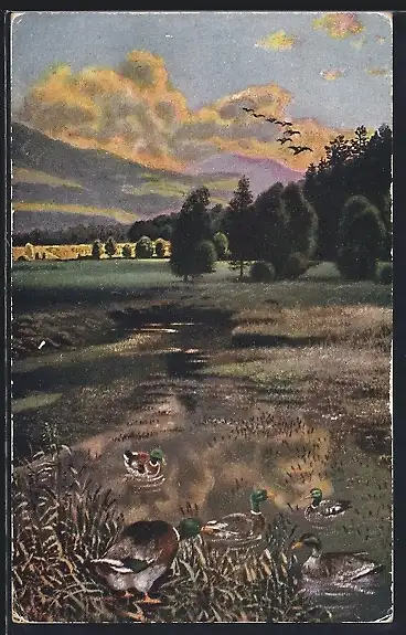 AK Enten in einem Teich am Waldrand