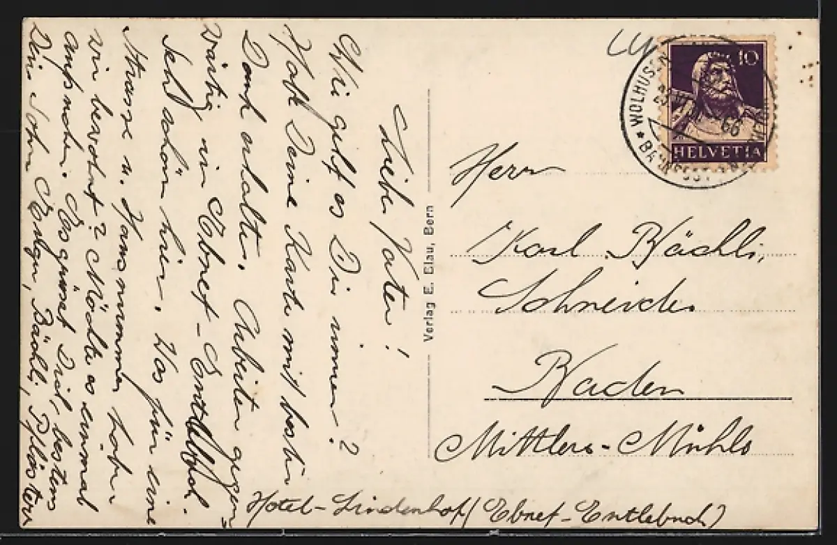 Personenbezogene Daten auf der Rückseite der Karte wurden durch blauen Textmarker unkenntlich gemacht. Die blauen Stellen sind auf die Vorderseite durchgeweicht und wirken sich negativ auf das Postkartenfoto aus