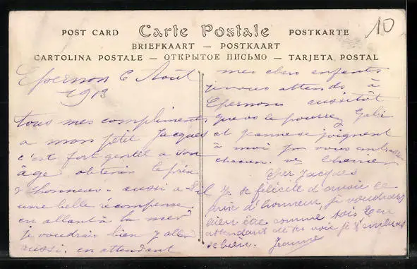 Personenbezogene Daten auf der Rückseite der Karte wurden durch blauen Textmarker unkenntlich gemacht. Die blauen Stellen sind auf die Vorderseite durchgeweicht und wirken sich negativ auf das Postkartenfoto aus