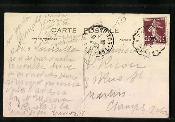 Personenbezogene Daten auf der Rückseite der Karte wurden durch blauen Textmarker unkenntlich gemacht. Die blauen Stellen sind auf die Vorderseite durchgeweicht und wirken sich negativ auf das Postkartenfoto aus