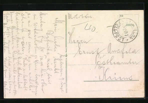 Personenbezogene Daten auf der Rückseite der Karte wurden durch blauen Textmarker unkenntlich gemacht. Die blauen Stellen sind auf die Vorderseite durchgeweicht und wirken sich negativ auf das Postkartenfoto aus