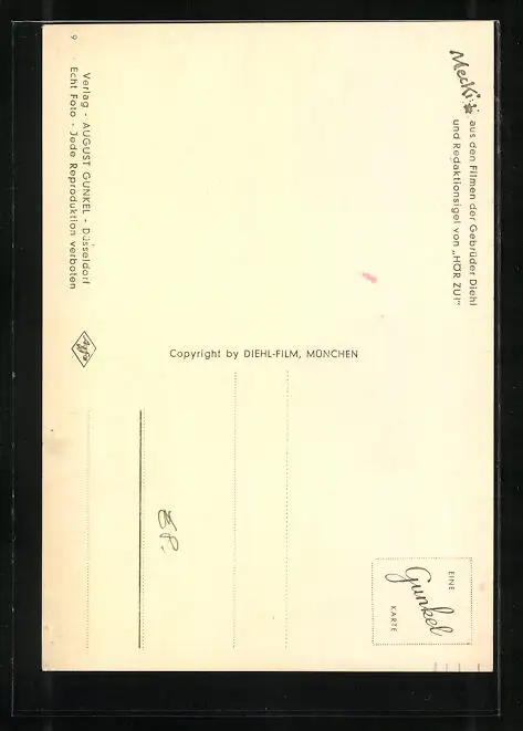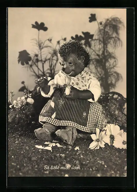 AK Er liebt mich doch..., Mecki-Frau mit einer Blume