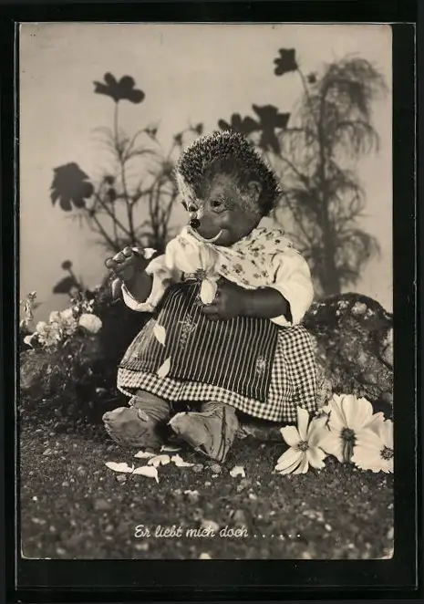AK Er liebt mich doch..., Mecki-Frau mit einer Blume
