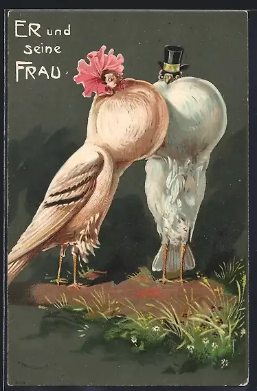 AK Er & seine Frau, Taube mit Zylinder