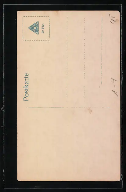 Personenbezogene Daten auf der Rückseite der Karte wurden durch blauen Textmarker unkenntlich gemacht. Die blauen Stellen sind auf die Vorderseite durchgeweicht und wirken sich negativ auf das Postkartenfoto aus