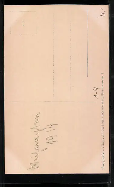 Personenbezogene Daten auf der Rückseite der Karte wurden durch blauen Textmarker unkenntlich gemacht. Die blauen Stellen sind auf die Vorderseite durchgeweicht und wirken sich negativ auf das Postkartenfoto aus