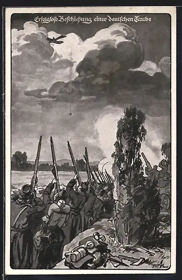 AK Erfolgreiche Beschiessung durch deutsche Taube, franz. Infanterie