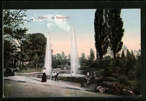 AK Erfurt, Besucher vor dem Springbrunnen im Stadtpark