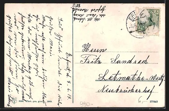 Personenbezogene Daten auf der Rückseite der Karte wurden durch blauen Textmarker unkenntlich gemacht. Die blauen Stellen sind auf die Vorderseite durchgeweicht und wirken sich negativ auf das Postkartenfoto aus