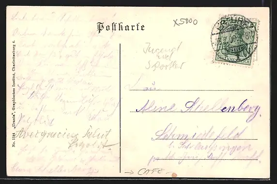 Personenbezogene Daten auf der Rückseite der Karte wurden durch blauen Textmarker unkenntlich gemacht. Die blauen Stellen sind auf die Vorderseite durchgeweicht und wirken sich negativ auf das Postkartenfoto aus