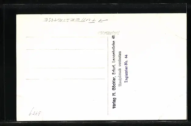 Personenbezogene Daten auf der Rückseite der Karte wurden durch blauen Textmarker unkenntlich gemacht. Die blauen Stellen sind auf die Vorderseite durchgeweicht und wirken sich negativ auf das Postkartenfoto aus