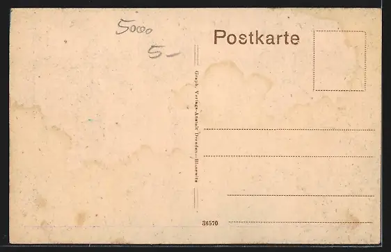 Personenbezogene Daten auf der Rückseite der Karte wurden durch blauen Textmarker unkenntlich gemacht. Die blauen Stellen sind auf die Vorderseite durchgeweicht und wirken sich negativ auf das Postkartenfoto aus