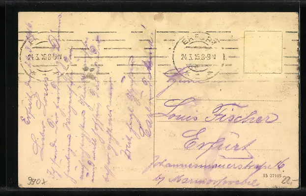 Personenbezogene Daten auf der Rückseite der Karte wurden durch blauen Textmarker unkenntlich gemacht. Die blauen Stellen sind auf die Vorderseite durchgeweicht und wirken sich negativ auf das Postkartenfoto aus