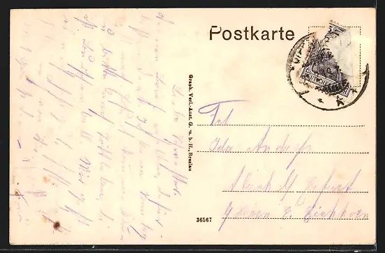 Personenbezogene Daten auf der Rückseite der Karte wurden durch blauen Textmarker unkenntlich gemacht. Die blauen Stellen sind auf die Vorderseite durchgeweicht und wirken sich negativ auf das Postkartenfoto aus
