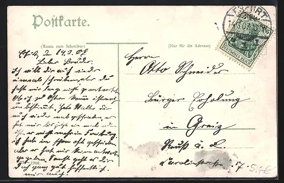 alte Ansichtskarte, gelaufen 1907, Eckknick unten re., Stempelspur, guter Zustand