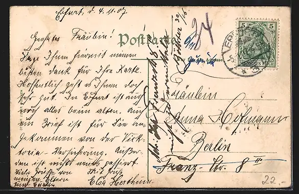 alte Ansichtskarte, gelaufen 1907, minimaler Abriebspuren oben li., Eckknick re. oben, guter Zustand