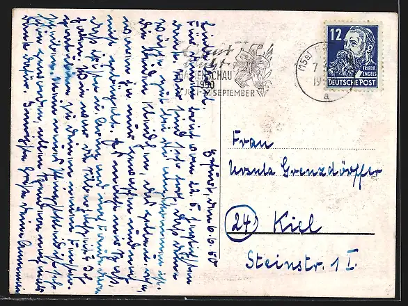 Personenbezogene Daten auf der Rückseite der Karte wurden durch blauen Textmarker unkenntlich gemacht. Die blauen Stellen sind auf die Vorderseite durchgeweicht und wirken sich negativ auf das Postkartenfoto aus