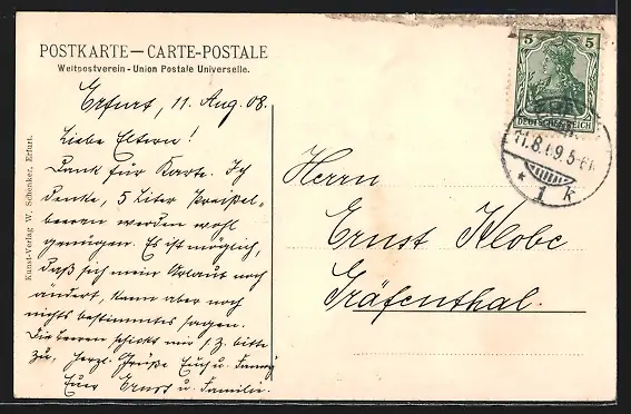 gelaufen 1908, vorder- u. rückseitig Klebe- und Papierreste, minimaler Einriss li. oben, guter Zustand