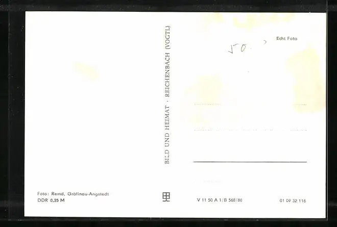 Personenbezogene Daten auf der Rückseite der Karte wurden durch blauen Textmarker unkenntlich gemacht. Die blauen Stellen sind auf die Vorderseite durchgeweicht und wirken sich negativ auf das Postkartenfoto aus
