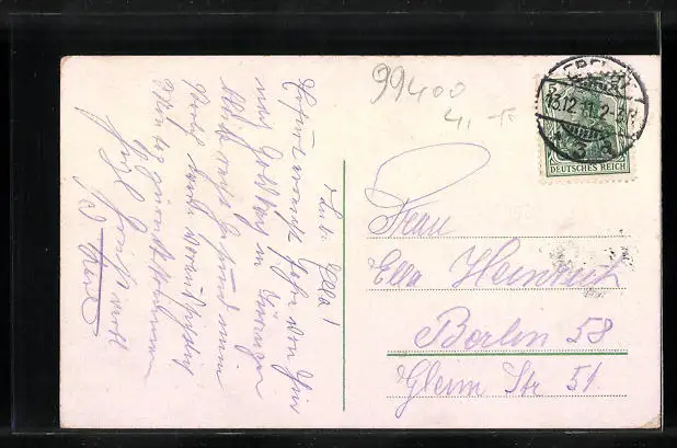 Personenbezogene Daten auf der Rückseite der Karte wurden durch blauen Textmarker unkenntlich gemacht. Die blauen Stellen sind auf die Vorderseite durchgeweicht und wirken sich negativ auf das Postkartenfoto aus