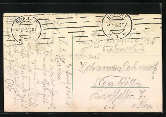 Personenbezogene Daten auf der Rückseite der Karte wurden durch blauen Textmarker unkenntlich gemacht. Die blauen Stellen sind auf die Vorderseite durchgeweicht und wirken sich negativ auf das Postkartenfoto aus