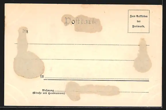 Personenbezogene Daten auf der Rückseite der Karte wurden durch blauen Textmarker unkenntlich gemacht. Die blauen Stellen sind auf die Vorderseite durchgeweicht und wirken sich negativ auf das Postkartenfoto aus