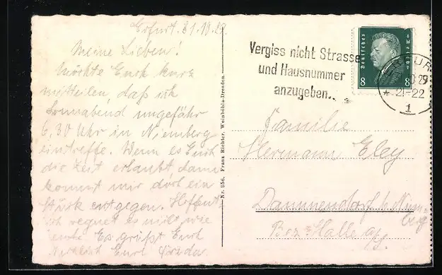 gelaufen 1929, Eckknicke oben li., guter Zustand