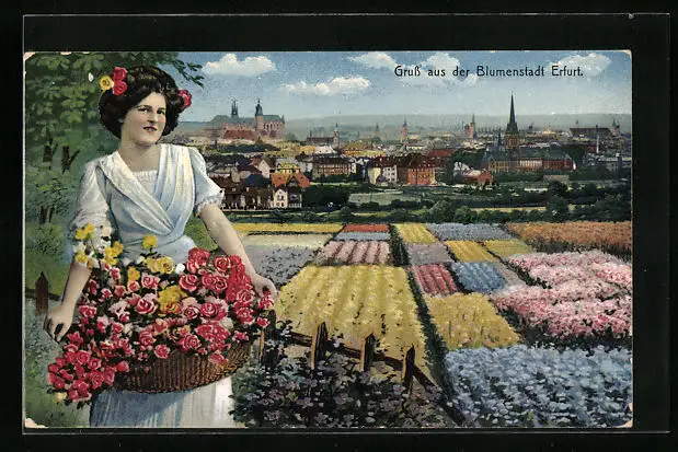 AK Erfurt, Stadtpanorama, Blumenfrau und Blumenbeete