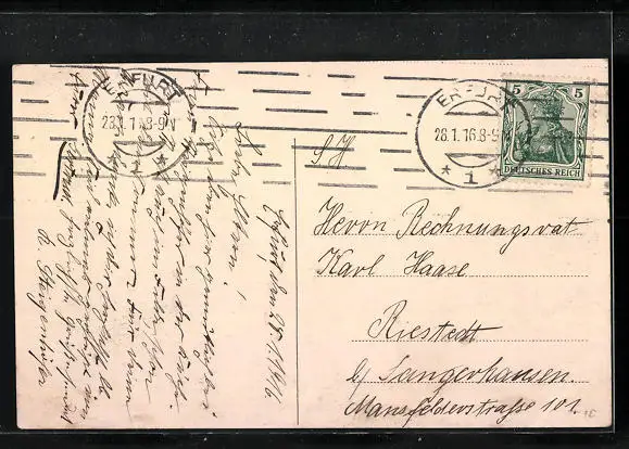 gelaufen 1916, Eckknicke li. oben, Stempelspur, guter Zustand